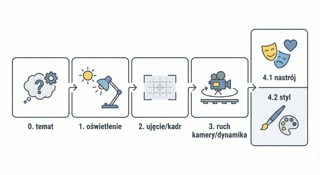 Skuteczny prompt to przemyślana konstrukcja, nie jedno zdanie. Aby przejąć kontrolę i uzyskać oczekiwane efekty, należy definiować elementy sceny w precyzyjnej kolejności.