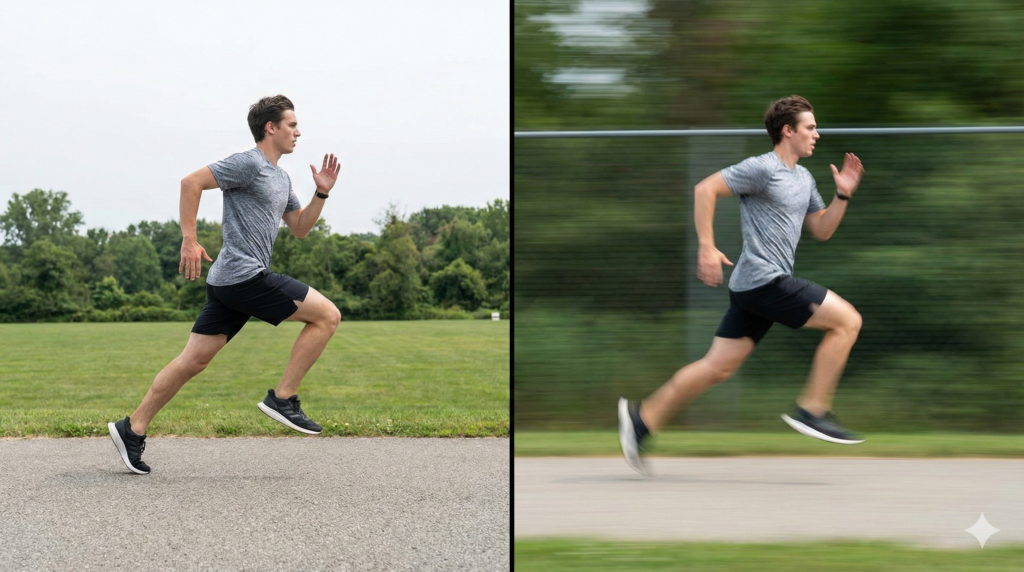 W grafikach statycznych określenie ruchu kamery (np. Whip Pan, Action Camera) dodaje rozmycie ruchu (motion blur). To jedyny sposób, by statyczny obraz wyglądał na dynamiczny i „szybki”, zamiast na zamrożony w czasie.