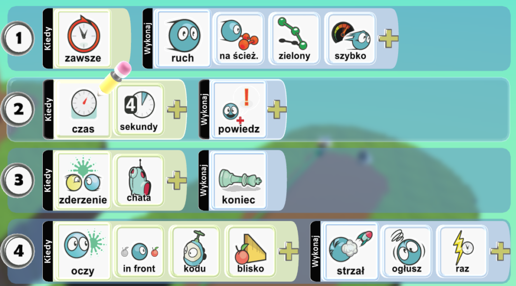 - 4 linijka nauczy bota, by strzelał ogłuszającym pociskiem, jeśli Kodu znajdzie się blisko przed nim.