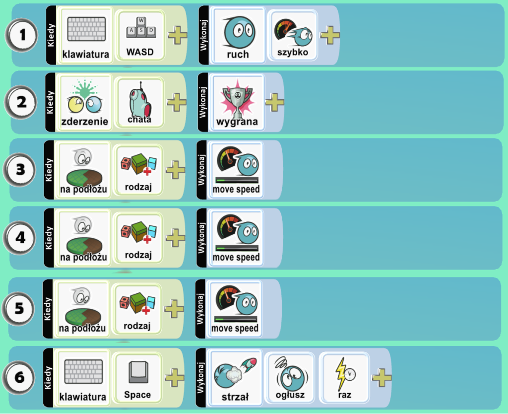 - 3, 4 i 5 linijka umożliwia zmianę prędkości Kodu na różnych rodzajach podłoża.