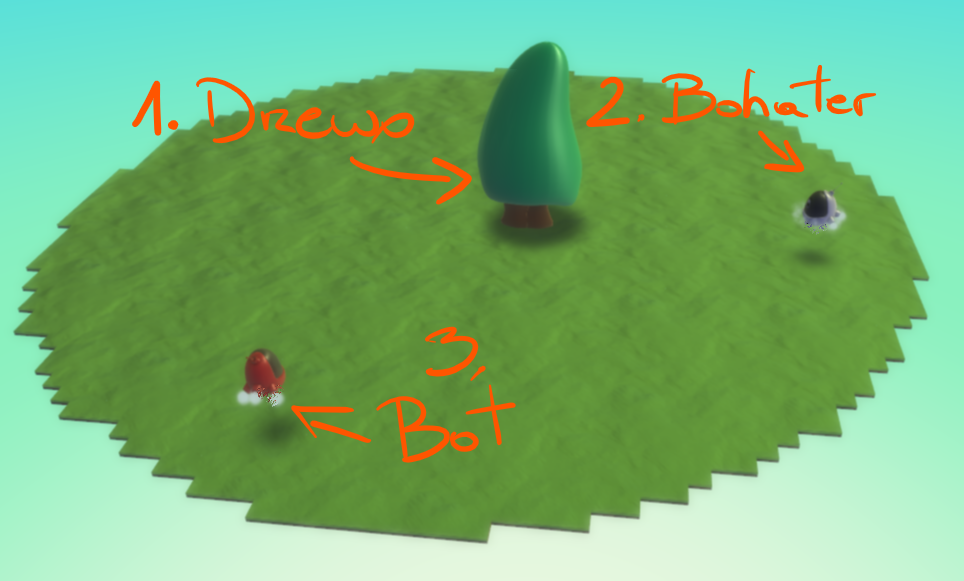 - Kodu, którym sterujemy, zbiera jabłka i przynosi je drugiemu Kodu (komputerowemu),