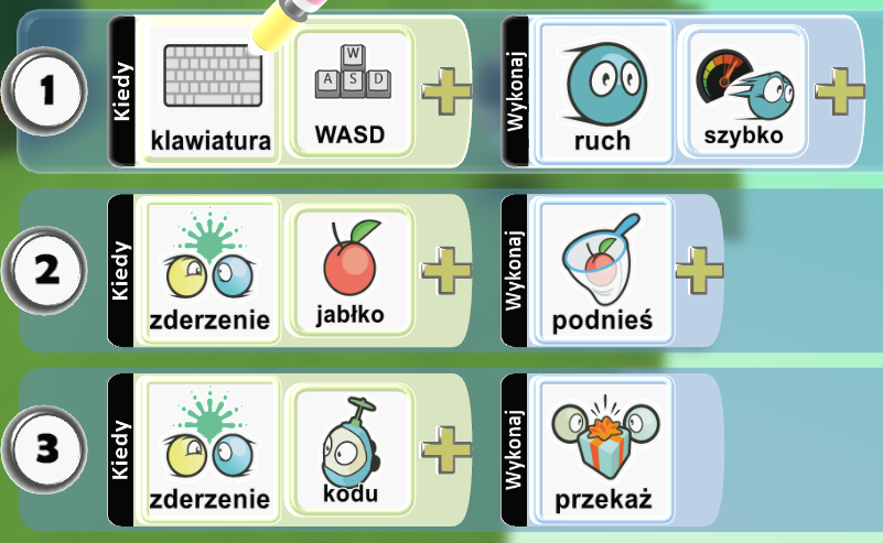 - 3 linijka mówi naszemu Kodu, że gdy podniesie jabłko i dotknie Kodu-bota, przekaże mu przenoszone jabłko.