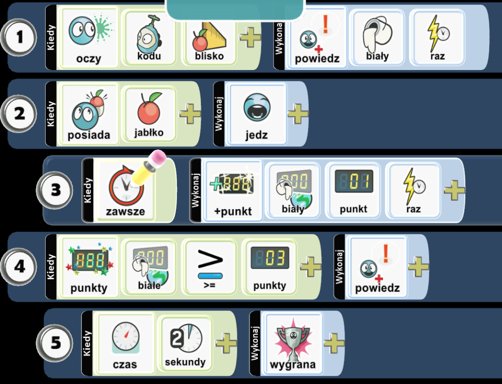 - 5 linia jest wsunięta względem czwartej. W efekcie gracz, który nazbiera 3 lub więcej punktów, po dwóch sekundach otrzyma komunikat o zwycięstwie.