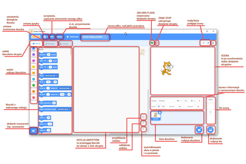 Na początku warto zapoznać się z interfejsem programu. Trzeba przyznać twórcom Scratcha, że jest bardzo intuicyjny i każdy użytkownik bardzo szybko poradzi sobie z obsługą.
